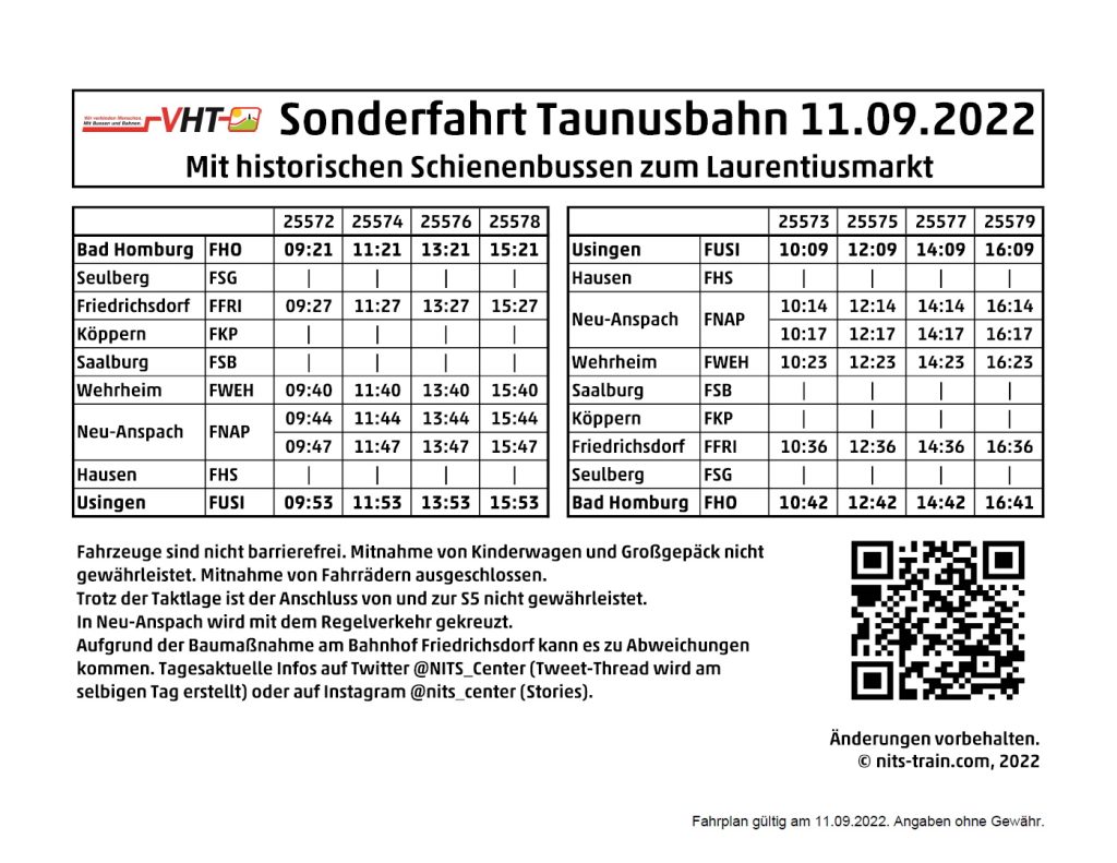 Am 11.09.2022 war es soweit: Nach ganzen sechs Jahren fahren Sonderzüge auf der Taunusbahn. Anlass hierzu ist der traditionelle Laurentiusmarkt in Usingen, welcher in diesem Jahr nach einer Corona-Pause wieder vor Ort stattfinden konnte. Um Gäste auch aus Frankfurt oder Vordertaunus einzuladen, wurden neben den Planzügen auch vier Zugpaare mit den Uerdinger Schienenbussen angeboten, welche ein Hingucker bei der Veranstaltung wurde. Denn: Die Züge konnten kostenlos bestiegen werden!