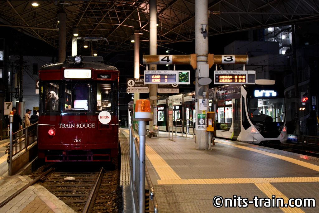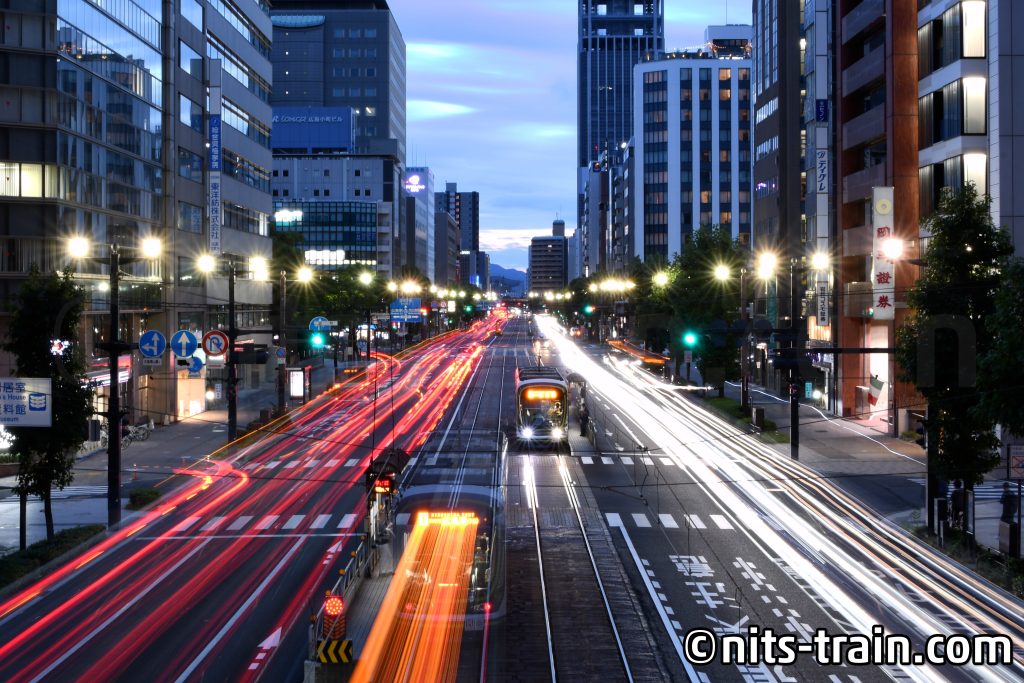Den erfolgreichen Tag schloss ich mit ein bisschen Langzeitbelichtung ab. Man merkt doch, dass Hiroshima, zwar nicht vergleichbar mit Tokyo, eine Großstadt ist und auch eine wichtige Bedeutung in dieser Region hat. Auch bemerkenswert ist, dass die Straßenbahn die Industrialisierungsjahre überstanden hat und nicht zu U-Bahnen oder Busverkehr umgewandelt wurde, sondern erhalten geblieben ist. So lässt sich auch, wie der Wagen 653, lebendige Protagonisten unterschiedlichen Zeitalters weiter lebendig erhalten, wie auch diverse Fahrzeugbaureihen unterschiedlichen Ursprungs wie die 602.