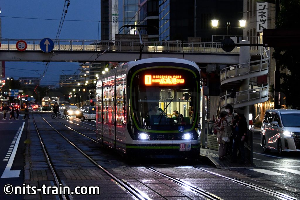 Bereits bei der Ankunft war es schon fast dunkel. Kurz ins Hotel um das Gepäck abzuladen, um dann direkt wieder nach Hiroshima Bahnhof zurückzufahren - der Treffpunkt unserer zweiten Sonderfahrt. Im leichten Regen steht Wagen 1014 an der Station Fukuromachi (Google-Maps).