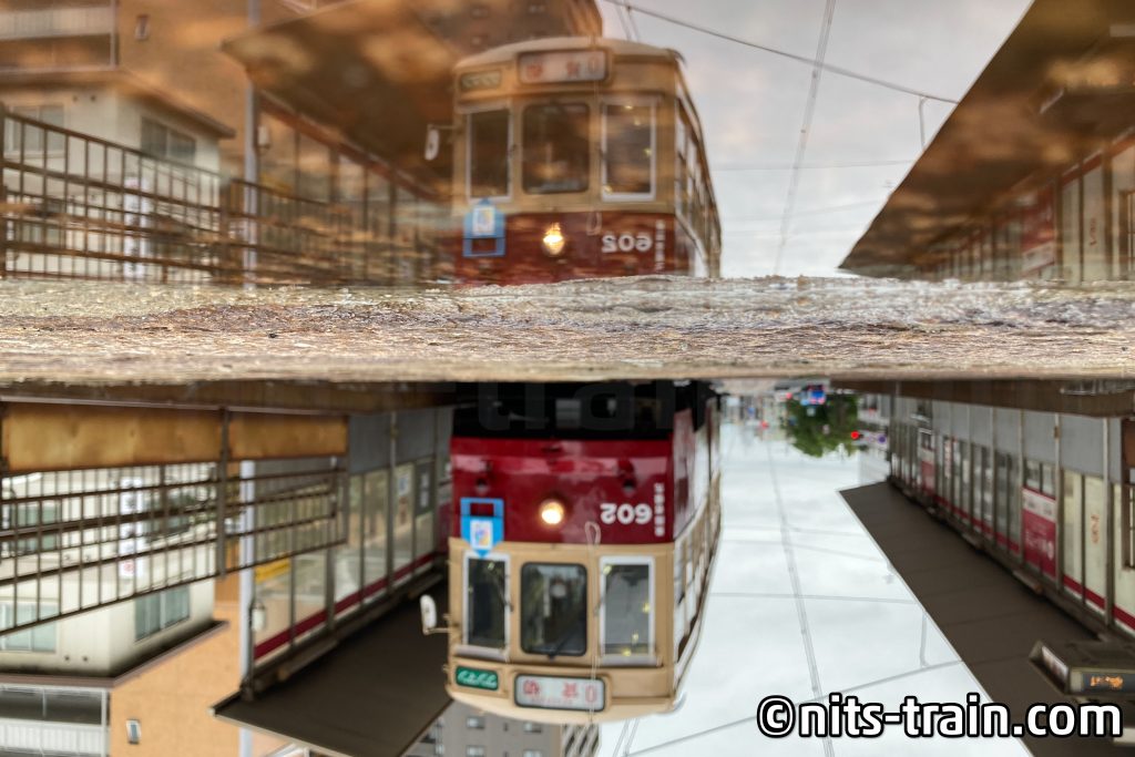 Über die Nacht hatte es recht stark geregnet, auch am Vormittag war der Boden nass. An der Haltestelle Yokogawa-1-Chome (Google-Maps) hatte der Wagen einen Aufenthalt aufgrund Vorfahrt anderer Züge. Die Standzeit nutzte ich, um ein Spiegelbild aufzunehmen. Das Bild ist um 180 Grad gedreht aufgenommen.
