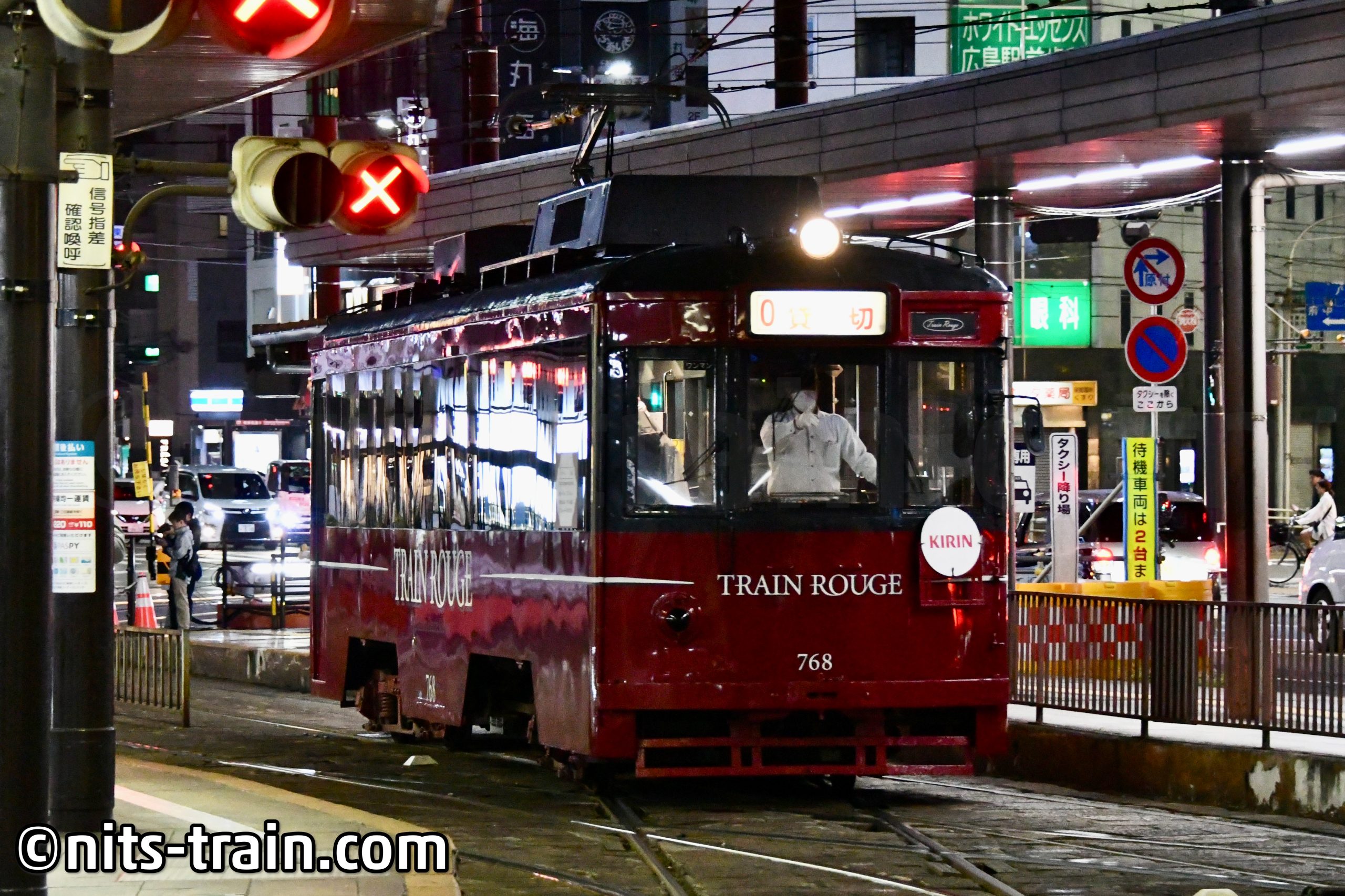 Als sich die Gruppe traf, war es bereits schon kurz vor der Einfahrt unseres Sonderzuges gewesen. Sobald fährt auch schon der Wagen 768 ein - unter dem Namen "Train Rouge" verkehrt dieser Partywagen nur auf Bestellung. Während der Wagen zu Corona-Zeiten nicht buchbar war, waren wir nach der langen Zwaangspause wohl die erste Gruppe, die sich den Wagen gemietet hatten. Im Wageninneren erhalten wir unsere alkoholischen Getränke - und ruckeln damit durch die Nacht Hiroshimas.