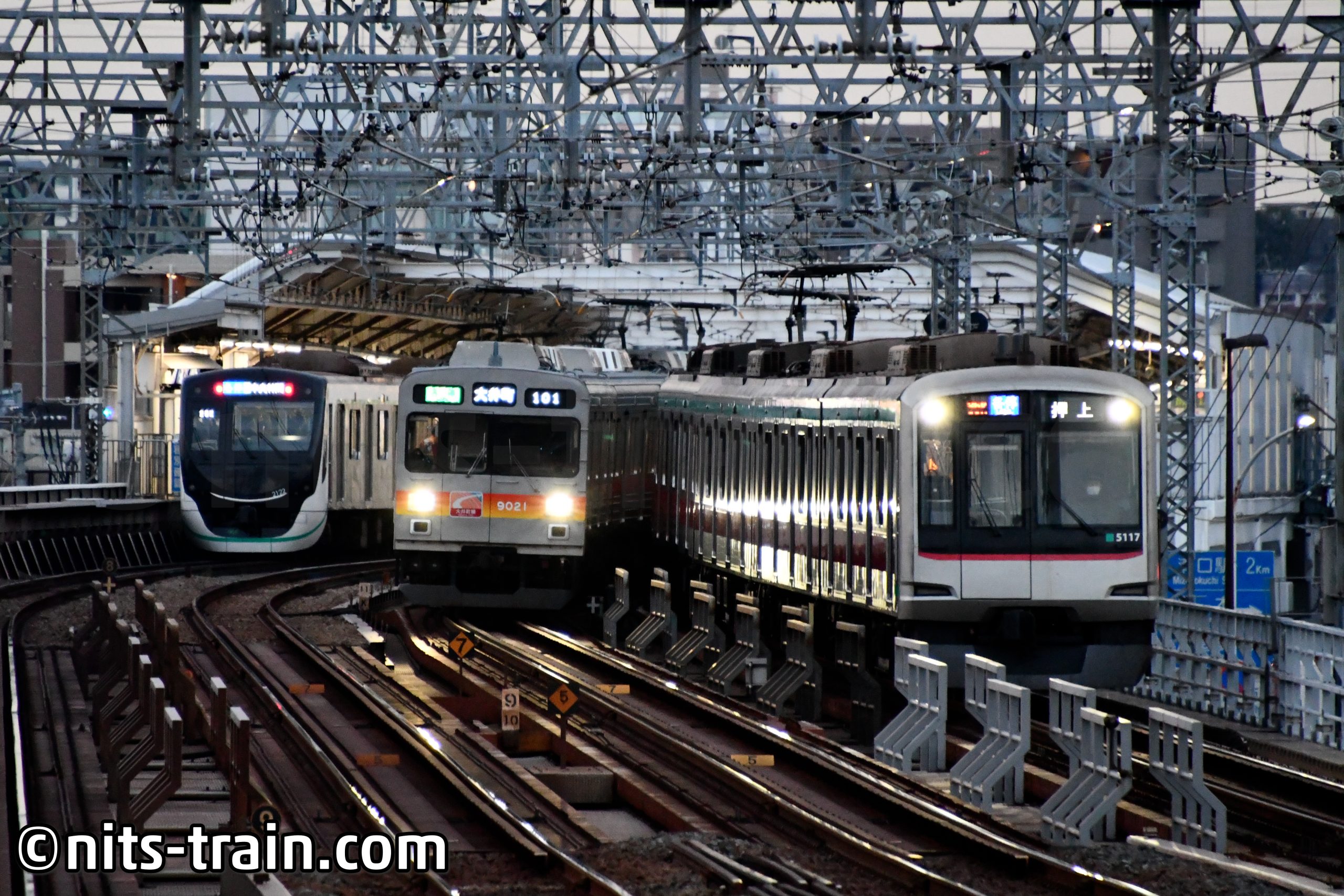 Drei Generationen der Tokyu-Eisenbahn. Hier gut zu erkennen ist auch die Serie 5000, welche für die Dennentoshi-Linie eine andere Linienfarbe trägt. Serie 9020 direkt nebendran ist aktuell die älteste Fahrzeuggeneration Tokyus, dahingegen die Serie 2020 links die neuste.