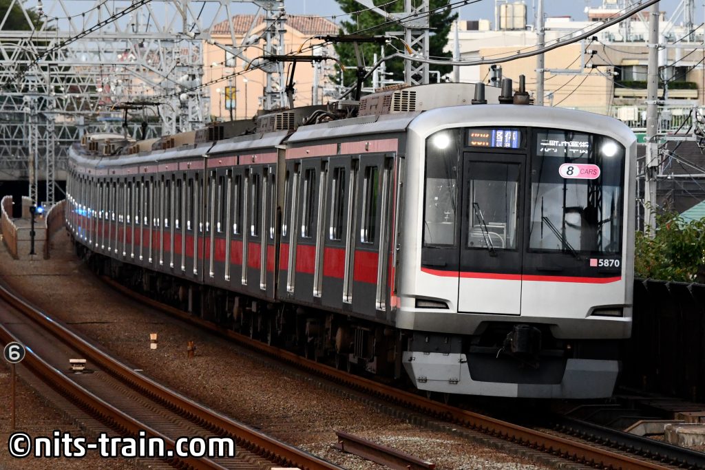 Die anderen Garnituren derselben Baureihe sehen völlig anders aus. Garnitur 5870 ist auch einer der "normalen" Garnituren. Während der rote Streifen die Farbe des Unternehmenslogos wiederspiegelt, ist der pinke Streifen für die Toyoko-Linie. Von dieser Baureihe gibt es auf den anderen Linien ebenfalls Geschwistergarnituren, die entsprechend andere Linienfarben besitzen.