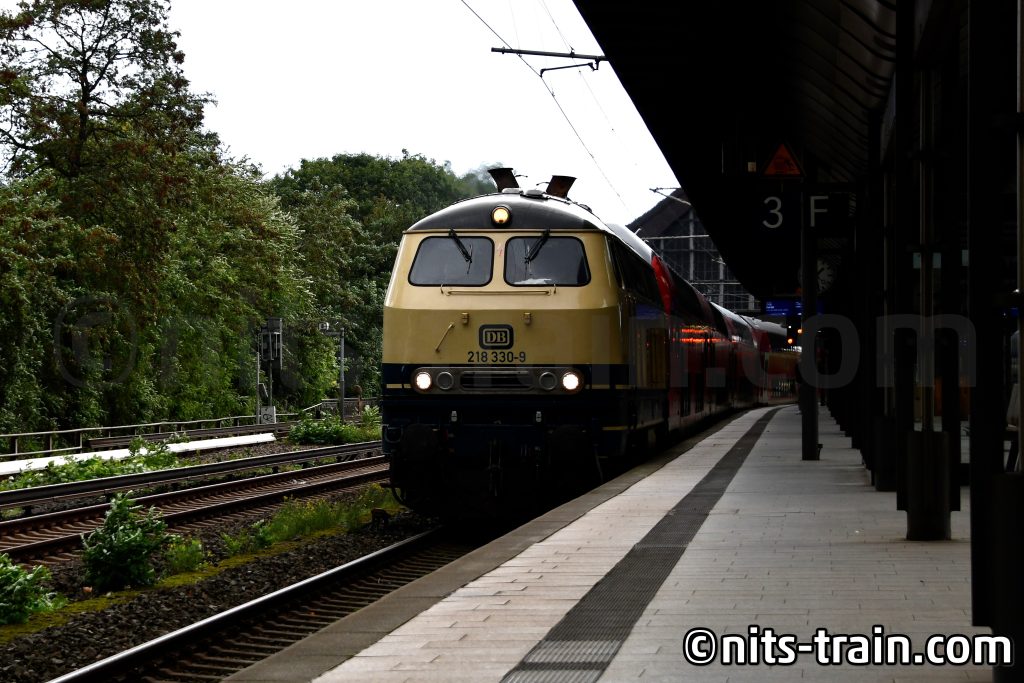 Während wir auf den Abschiedswagen warteten, kam eine Sandwich-Garnitur mit 218ern. Die parallele Einfahrt des Sonderzuges und diesem Ersatzzug brachte uns schon Sorgen, aber zum Glück war die 218 schneller weg. Hier noch gut zu erkennen, dass es zwar sehr bewölkt ist, aber noch trocken.
