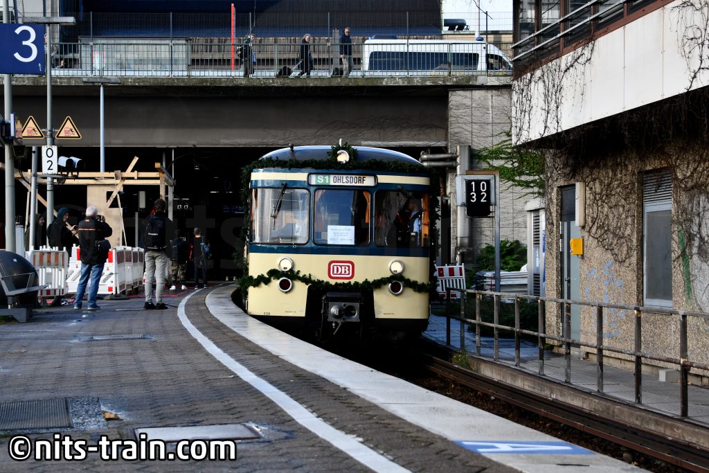 Die erste Fahrt startet. In die vollen Wagen habe ich mich erst gar nicht reingetraut, sodass ich mich mit dem Planzug davor an die Station Landungsbrücken begab. Die obere Platform war bereits mit Fotografen gefüllt, sodass ich mich direkt an den Bahnsteig stellte. Mit einem Hupkonzert fährt die Einheit in den Bahnhof hinein.