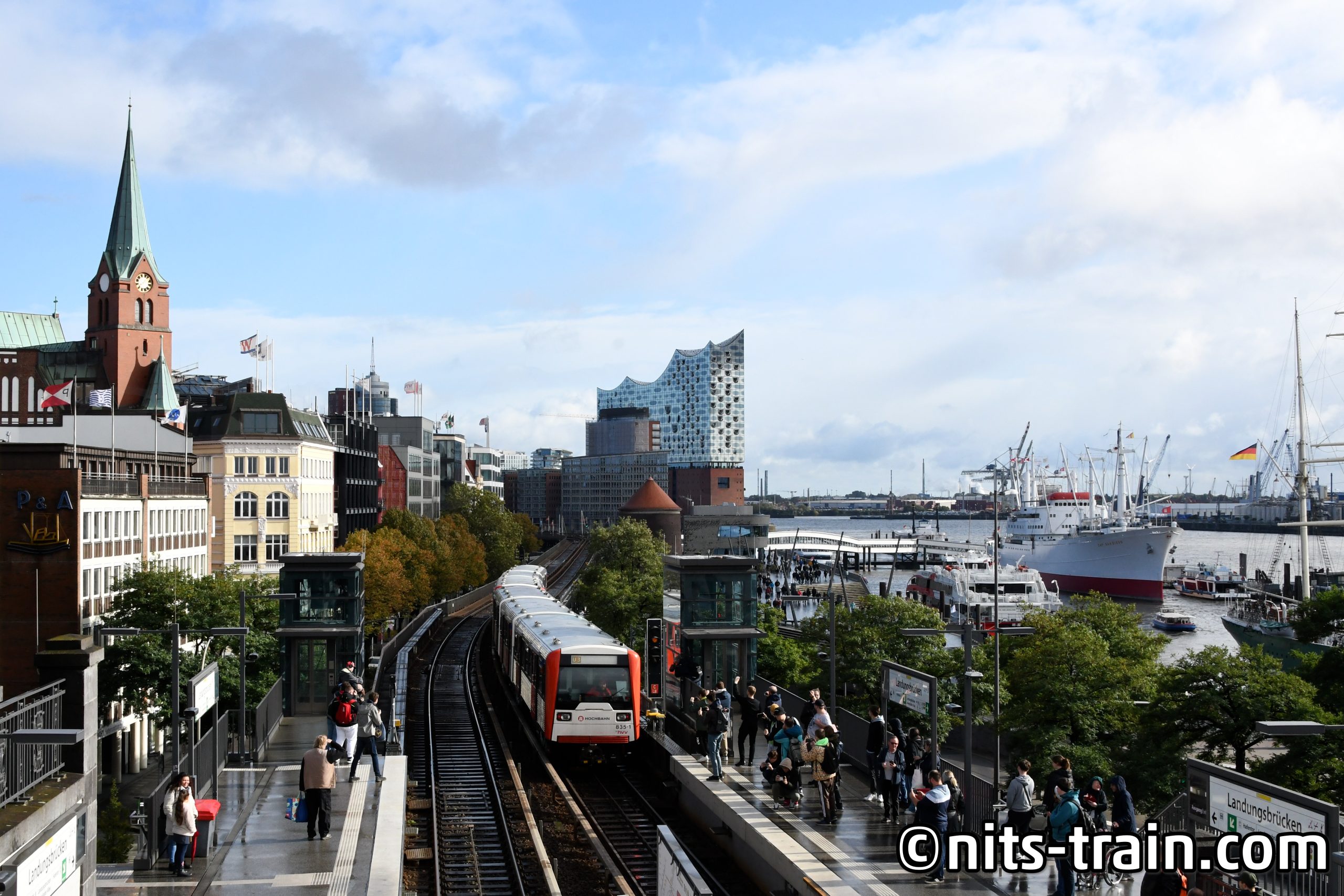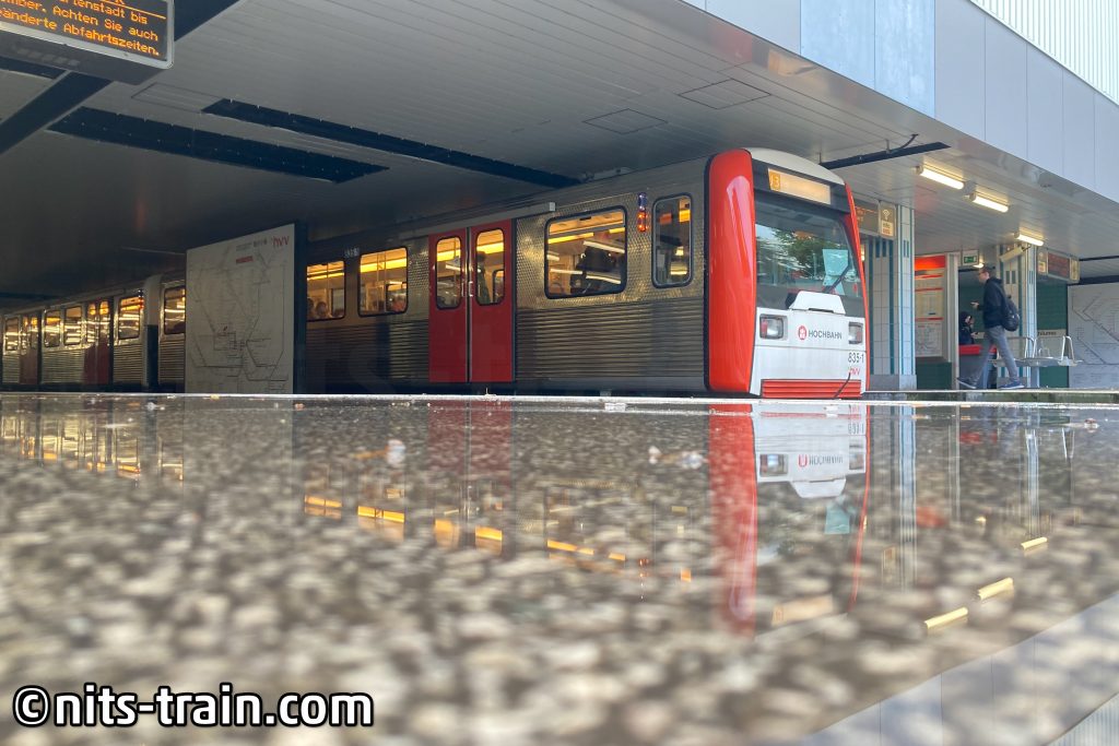Ein bisschen in der Gegend die Zeit verbracht, um auf der nächsten Runde eine Aufnahme zu erstellen, worauf man gut erkennt dass es sich um Hamburg handeln muss. Auch wenn die Wolken meinen mussten, sie müssten die Spitze der Elbphilharmonie abdunkeln, ließ ich mich nicht davon abhalten, als der DT3 auf der nächsten Runde die Station verlässt. Auch auf dem Bahnsteig gut zu erkennen, dass es doch sehr viele Fotografen an die Strecke gezogen hat, um die doch einzigartigen Fahrzeuge zu verabschieden.