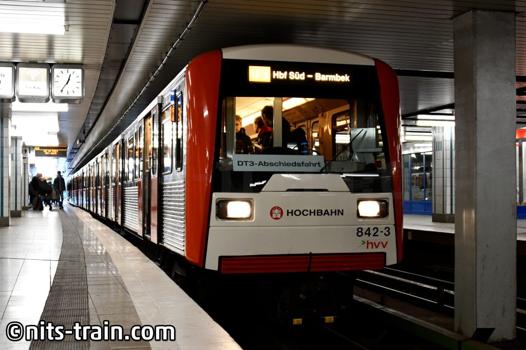 Am Folgetag war es Zeit für die letzten DT3-Einheiten der Hamburger Hochbahn. Mitunter auch ein Vorbild der Taunusbahn-2Es geworden, waren sie seit 1966 auf den Schienen der Hochbahn unterwegs. Am letzten Einsatztag waren die Garnituren 835 und 842 in Schlump bereitgestellt worden und warteten hier auf die Abfahrt auf ihren letzten Fahrten.