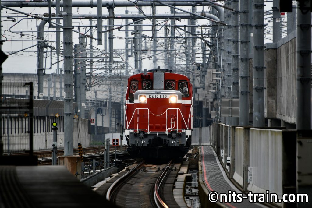 Und siehe da, es kam eine Überführung. Eine der wenigen verbliebenen Diesellokomotiven auf japanischen Schienen, Baureihe DE10. Seit meiner Kindheit zu Hause als Modellbahn geliebt, aber in der Realität zum ersten Mal gesehen.