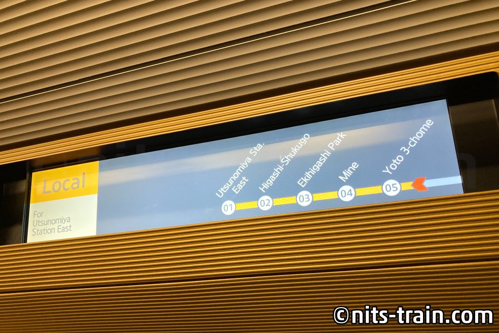 車内の案内表示にも目を向けてみる。駅名の英語表記の部分のフォントがほかの統一された書体とは異なることが気になってしまったが、比較的わかりやすく情報過多でもないすっきりとした表示。