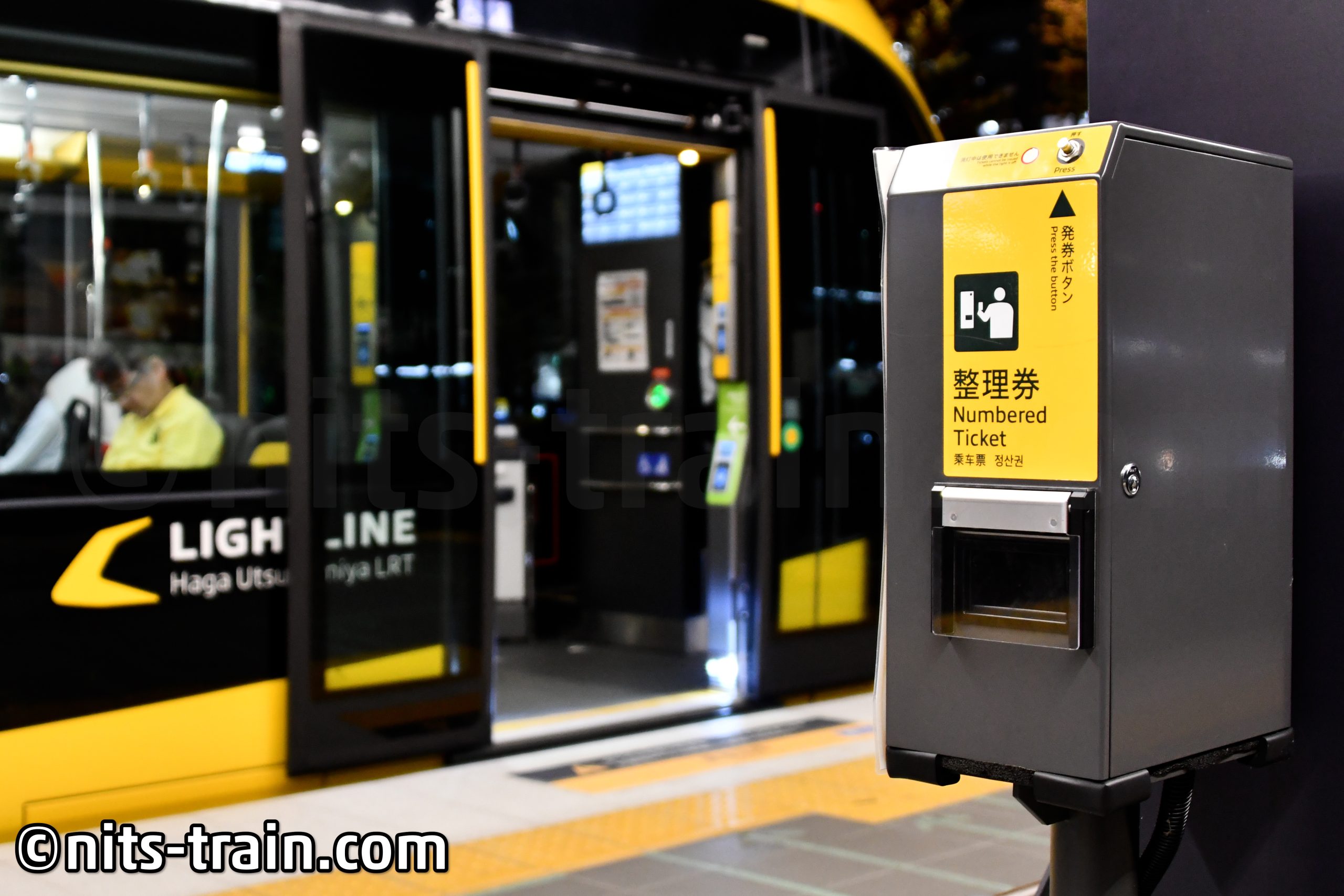 宇都宮駅電停の整理券発行機。開業当初はICカードより現金払いの利用者が多かったと聞くが、一か月たったところで整理券を引いている方はそんなに見なかった気がする。