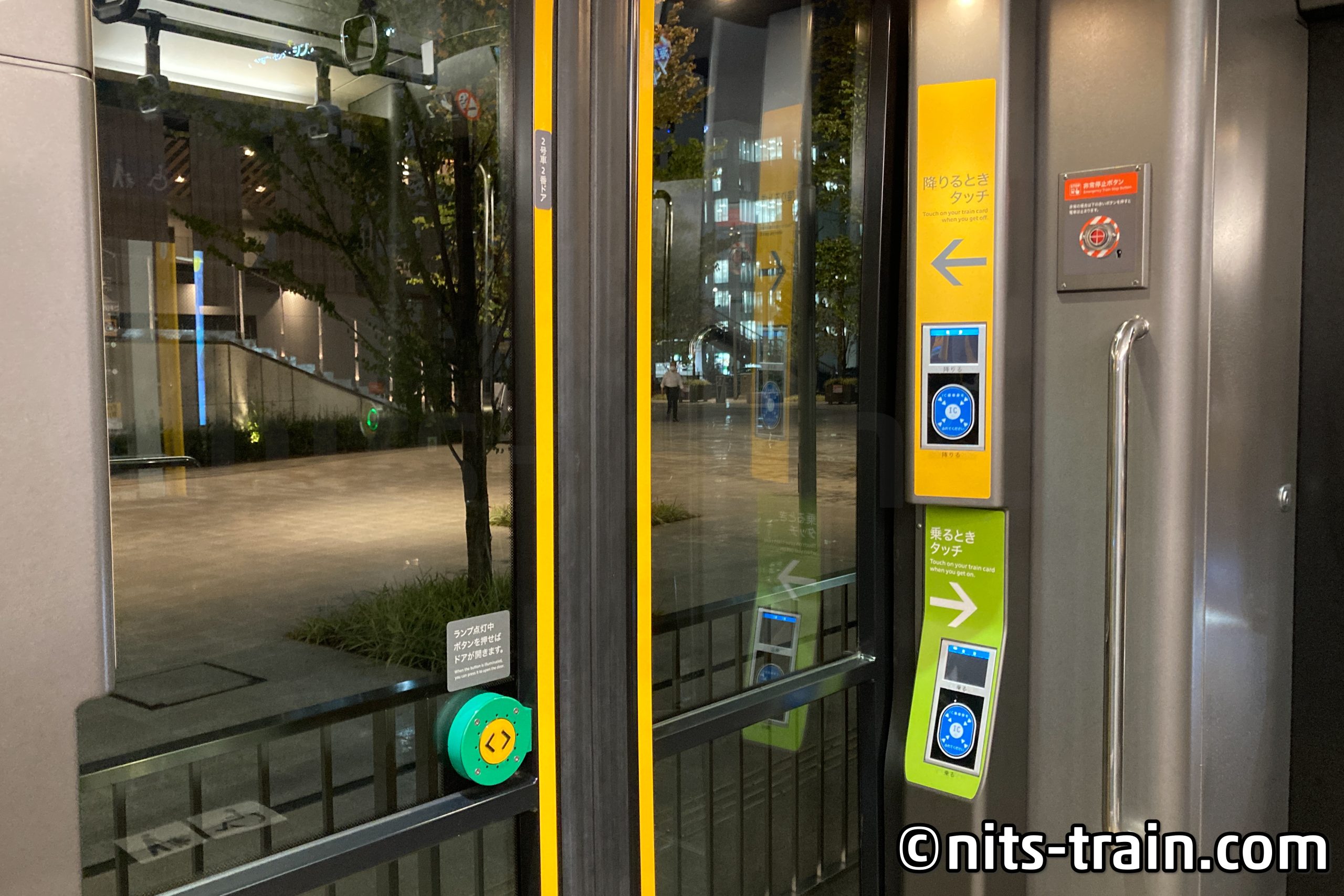 ICカード利用者はどこからでも乗降可能なのも便利。しかも各扉の片側だけでなく、両側についているのもナイス。そしてドアボタンに欧州の親近感がわく。視覚障碍者向けのアクセントなのか、ドア部分の黄色い線は車内でも使われているCIの黄色より目立つ色をしているようにも見えた。