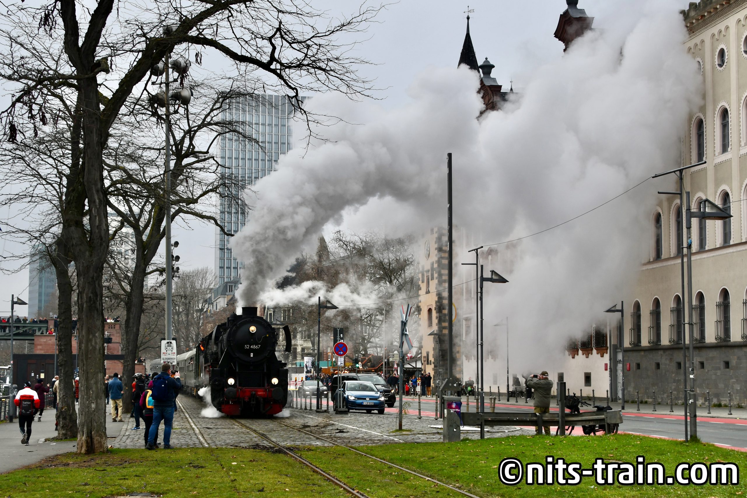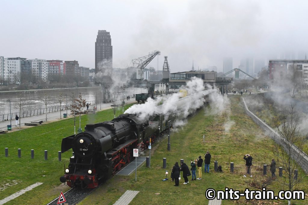 レーマー広場のクリスマスマーケットを素通りして、マイン川沿いの線路へ。すでに蒸気機関車がスタンバイしており、まもなく出発とのことだったので私たちも構えの姿勢へ。