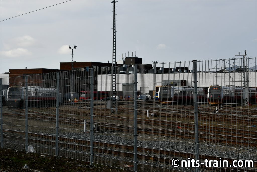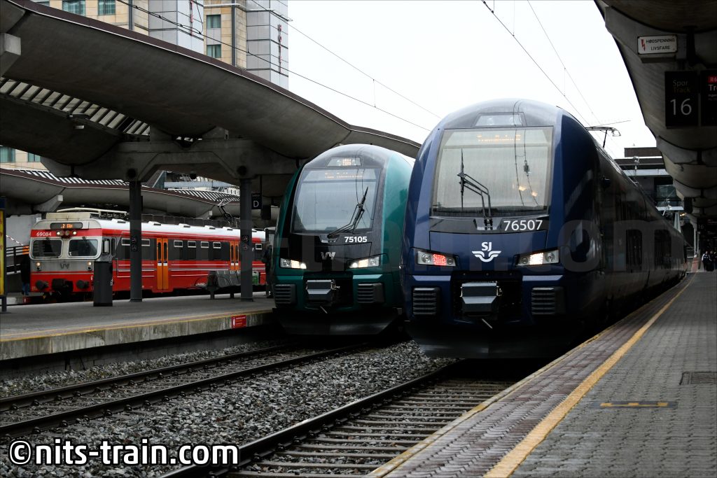 本線側のホームに戻ると、どうやらダイヤが乱れている様子。そんな中、一日一本だけオスロ中央駅まで乗り入れる76型が停車していたので、隣の抑止されている車両たちと並びで記録。76型は基本構造が75型や74型と同じではあるものの、ハイブリッド車ともありユニットが一両分違うので長さの違いも横に並ぶとわかりやすい。