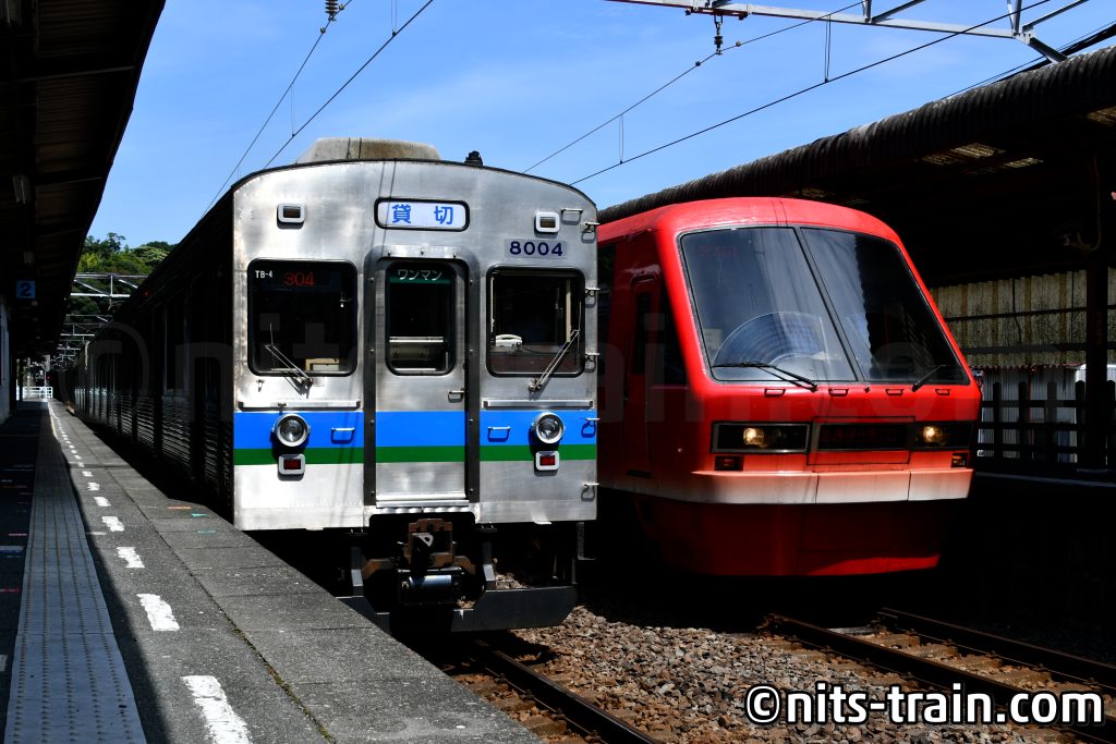 行きの列車でもそうでしたが、帰りも対向列車を待つ駅で扉を開放していただけたので、少しばかり通常列車との横並びを撮影することができました。もちろん列車の運行に支障が出ないように、信号が切り替わる前に列車に戻り、定刻通りの運転で貸し切り列車の最終目的地の伊豆高原駅に到着。