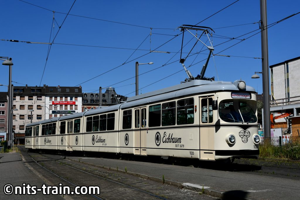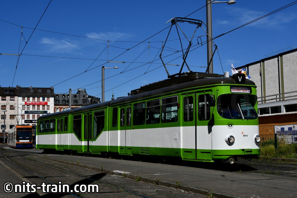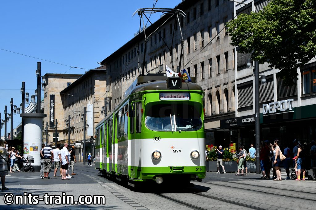 続いてやってきたのはGT8N型の(5)516号編成。1964年製のこちらの編成、つい先月まではrnvのオレンジベースのカラーリングだったのですが、(5)501号編成が廃車されてしまったためこの編成が旧塗装となることに。再塗装されてから本線走行をするのはおそらく今回が初めてだったので、かなり綺麗な状態で記録できました。