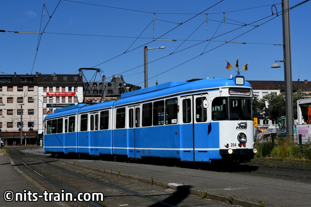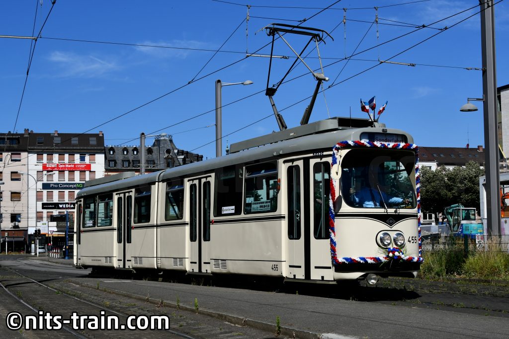 トップバッターは装飾されたGT6型の455号編成。こちらは1969年製の車両で、運転席の窓が既存のデュワグ顔と異なり大型化したもの。ここに導入されたきっかけでマンハイム型と呼ばれるタイプです。