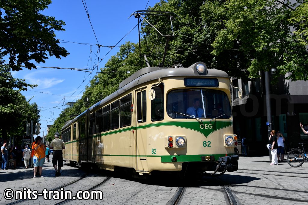 V6の後に続くのは、車幅が同じ2.50mのワイドボディ車のGT8。1966年製のこちらの(40)82号編成は、他の市内線向けのGT8と違い鉄道線向けの横幅なので、似たような顔でもやや広く感じる。2.50mはこの2形式だけだったこともあり、市内区間の走行制限などもあったことから早めに置き換えたかったのだろうか。