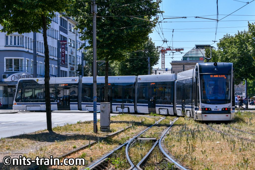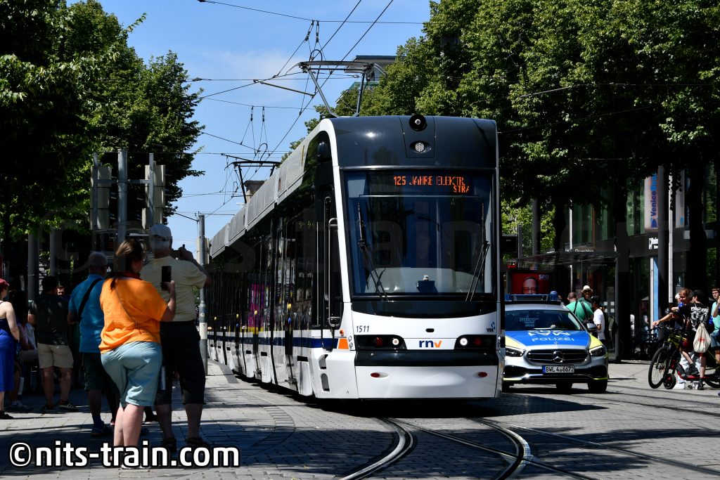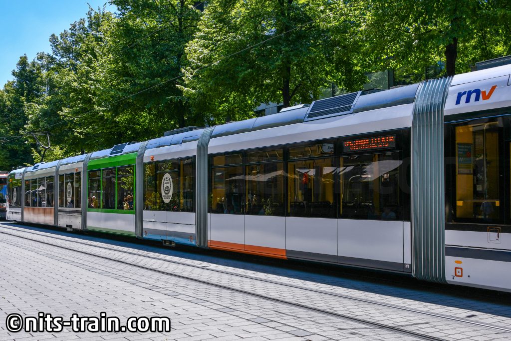rnvは元は20年前に複数の会社が合併して誕生したもので、それ以前は車両は同じものを発注しながらも色が違ったりしたわけですね。そのrnvの20年前のカラーバリエーションを進行方向右側に、市電125周年の歴史カラーを左側にラッピングしています。