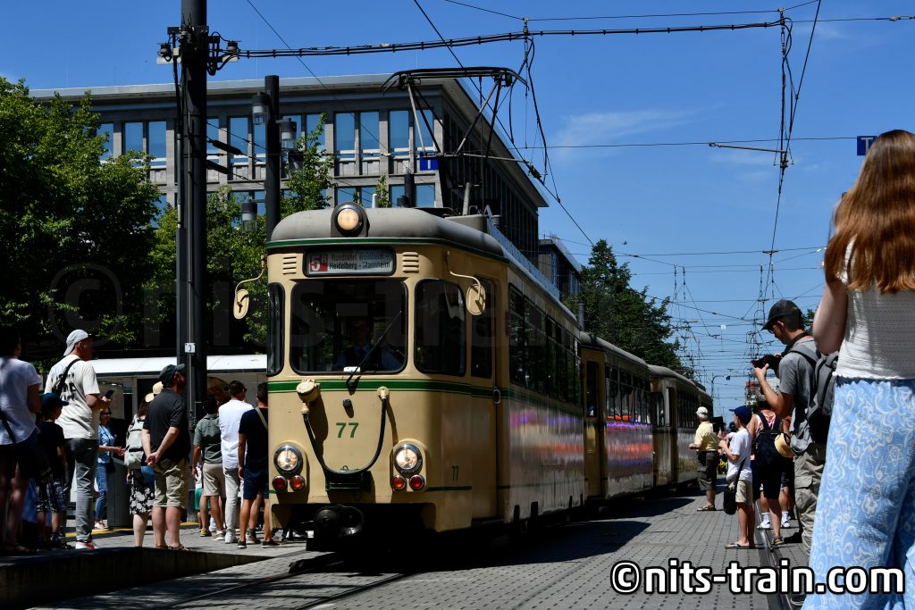 人が多すぎて満足いくほど記録できなかったRastatt型。1963年に製造された単車で、間に付随車を2両挟んだうえで動力車のサンドイッチ、4両編成でやってきました。後ろには銀色帯の付いている71号車だったので、個人的にはそちらを先頭にしてほしかった。