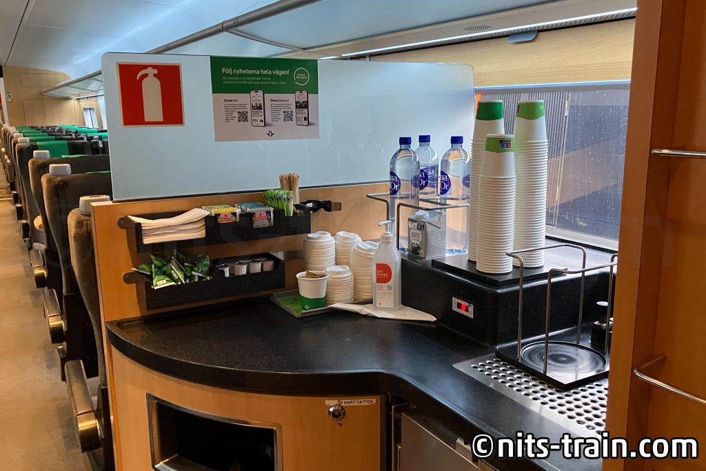 1等車は基本的にデンマークと似たような感じで、コーヒーと水がフリードリンクとして提供されます。提供というかセルフサービス?