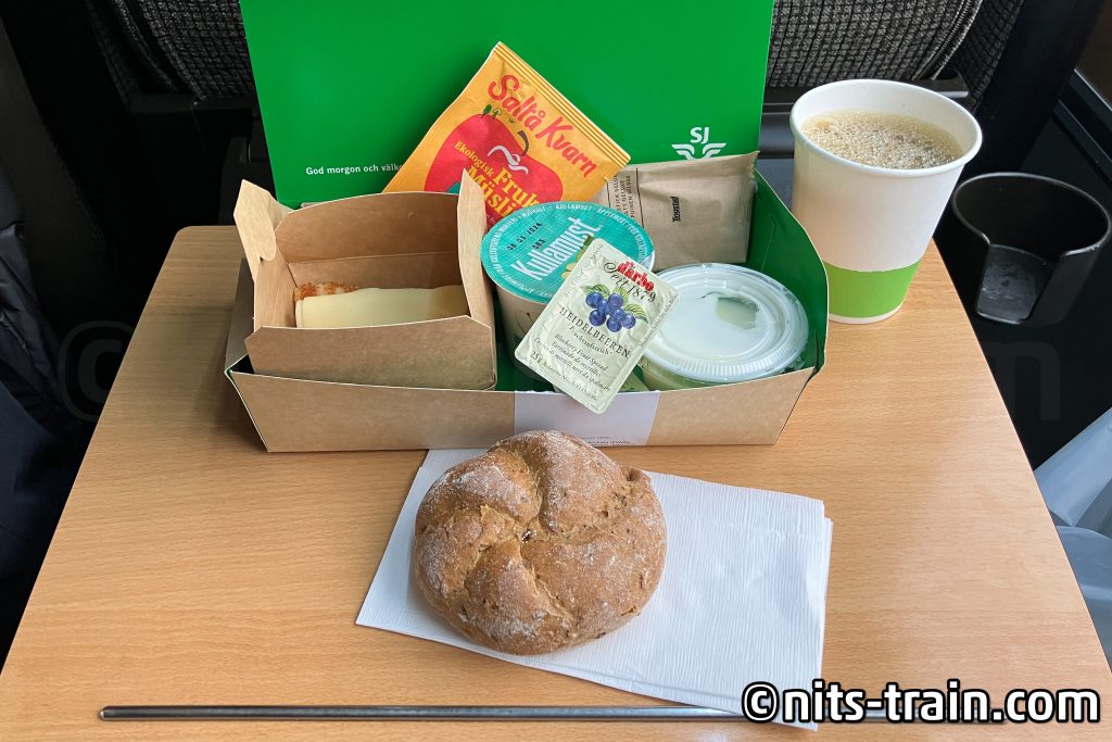 1等車は朝方に乗車すると無料で朝食が提供されるんですよ。パンにチーズやジャム、リンゴジュースとヨーグルトがボックスに入って提供されます。